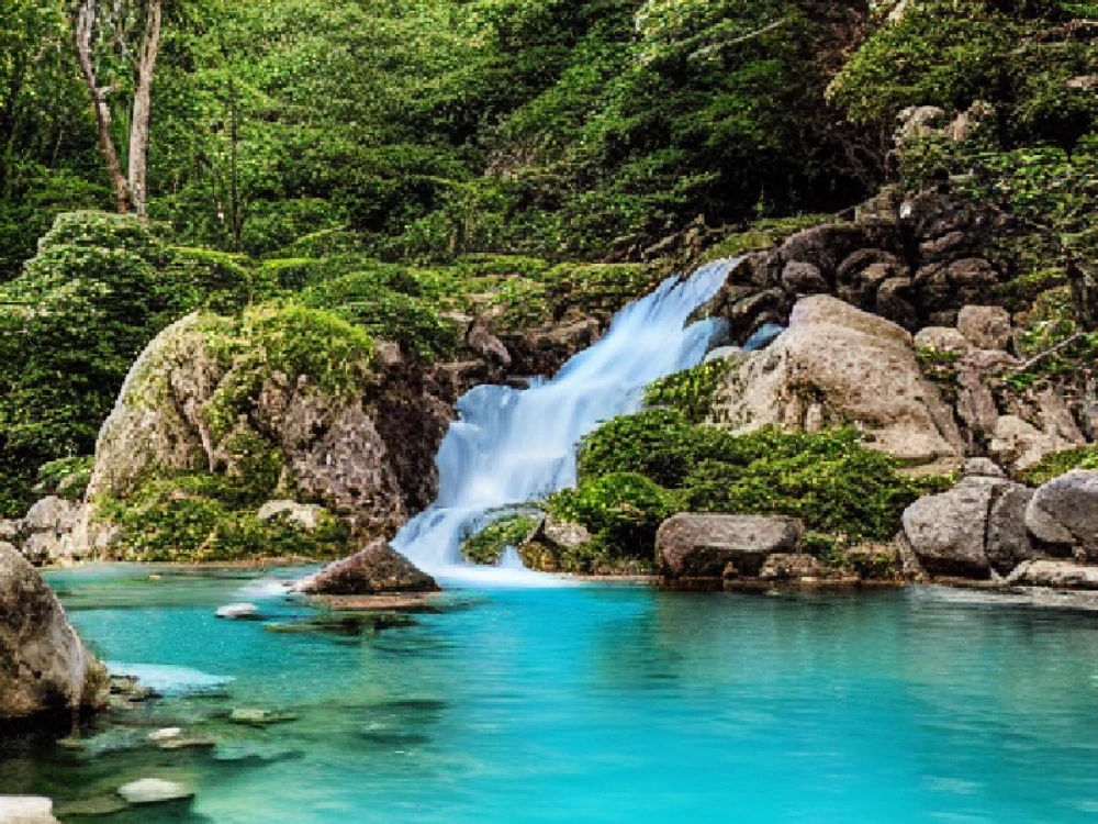 Torrents of turquoise water cascade down moss-draped boulders, plummeting into a crystal-clear pool surrounded by emerald foliage. The air is alive with the sweet scent of blooming flowers and the gentle chant of tropical