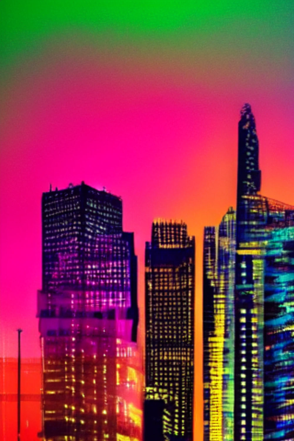 Neon hues dance across the dark canvas, as skyscrapers pierce the velvet sky like shards of glass. Headlights weave a mesmerizing tapestry, while the urban hum thrums through the air like a living entity, illuminating the