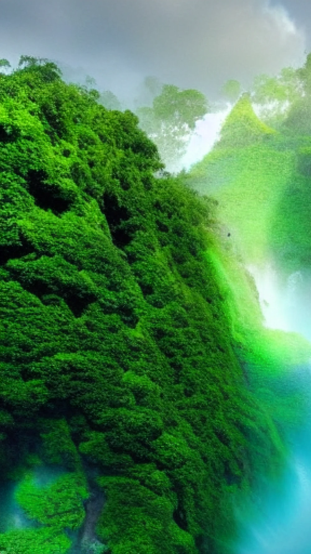 Above a shimmering iridescent mist, majestic islands suspended in mid-air, their lush canopies a vibrant tangle of emerald and amethyst. Wispy waterfalls cascaded from crystal shores, plunging into the ethereal veil below,
