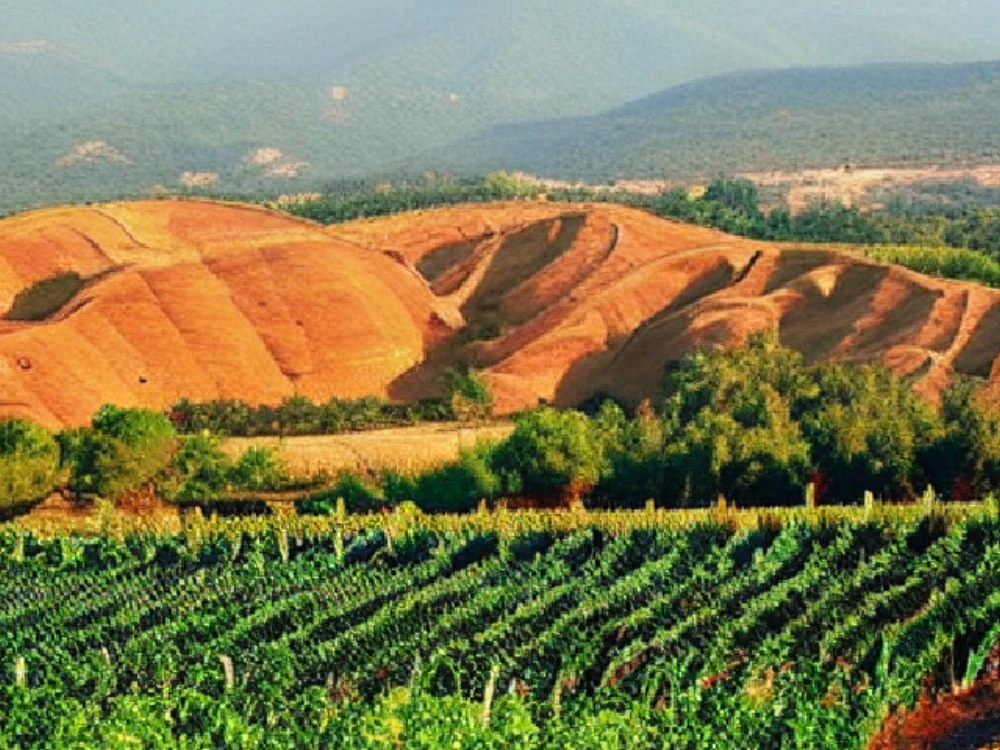 Amidst sun-kissed terracotta hills, a lush vineyard sways gently in the autumn breeze, its heavy clusters of emerald-hued grapes bursting with juicy sweetness, ripe and ready for the harvesters' eager hands to pluck them f