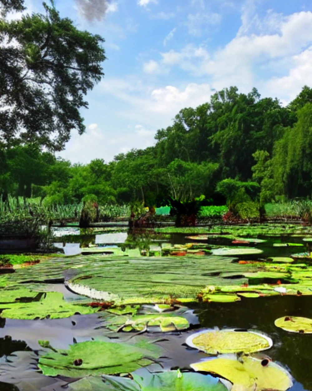 A pond with lily pads and blooming lotus flowers, Ancient ruins reclaimed by nature