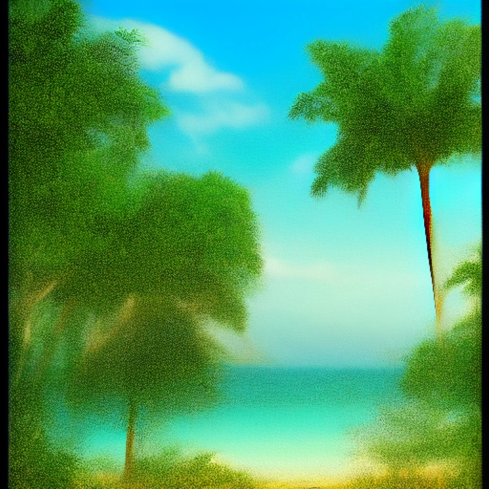 A lush jungle with exotic plants and animals, A tropical beach with palm trees and clear blue water