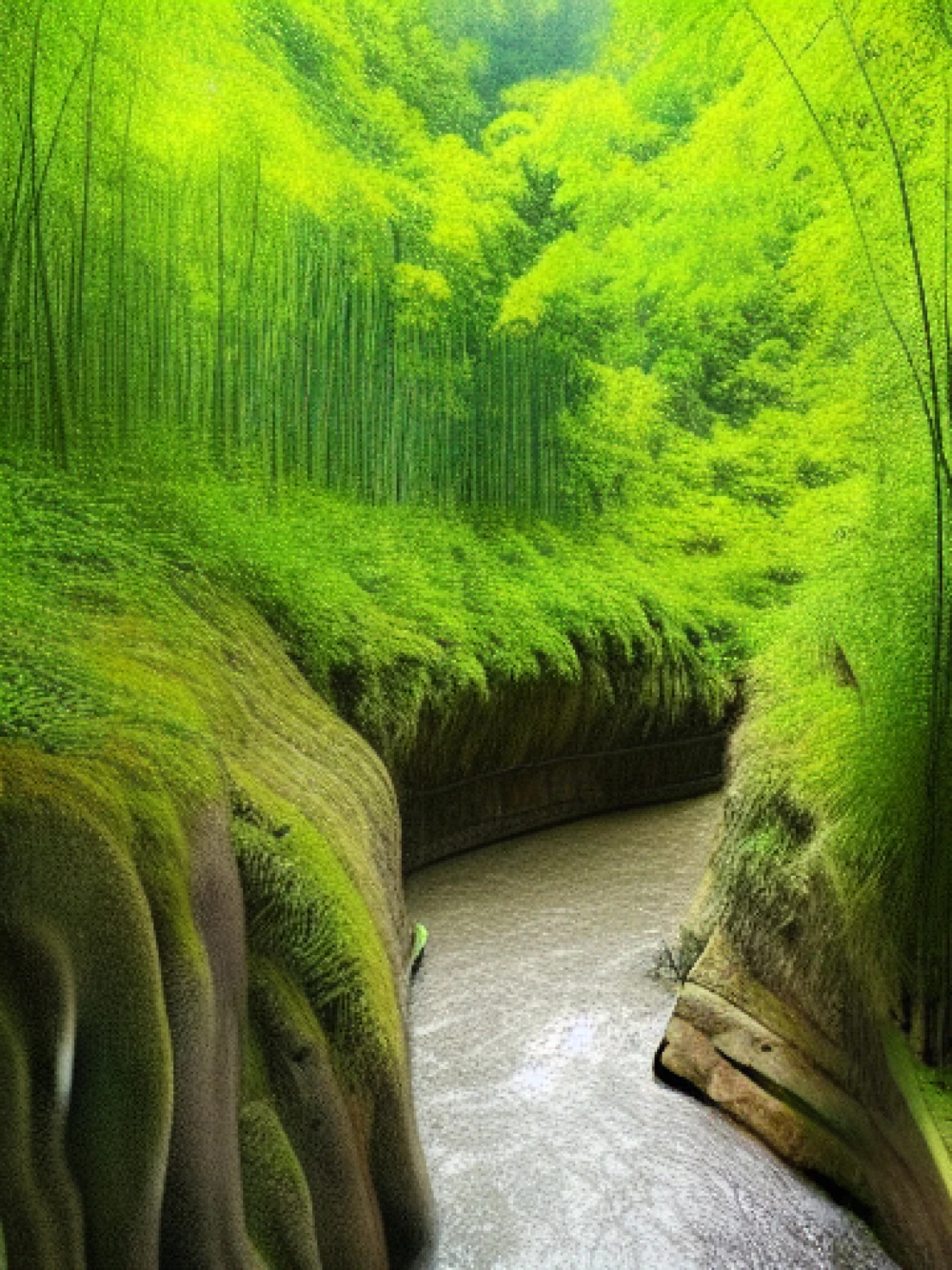 A deep canyon carved by a swift river, A tranquil bamboo forest