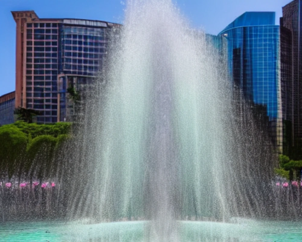 In the heart of the bustling metropolis, a majestic fountain stands tall, its crystal clear waters dancing in the sunlight, creating a mesmerizing display of liquid joy. Delicate jets of water weave an intricate rhythm, as