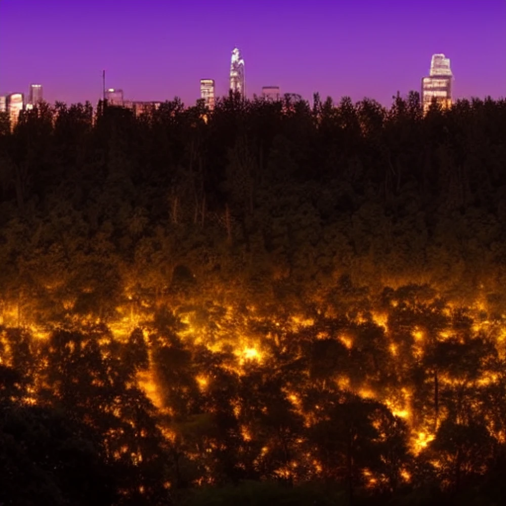 A panoramic view of a modern city skyline at dusk, Fireflies illuminating a dark forest