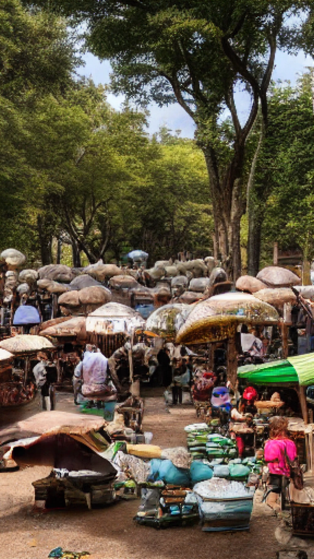 A bustling marketplace in an ancient city, A group of mushrooms growing in a forest