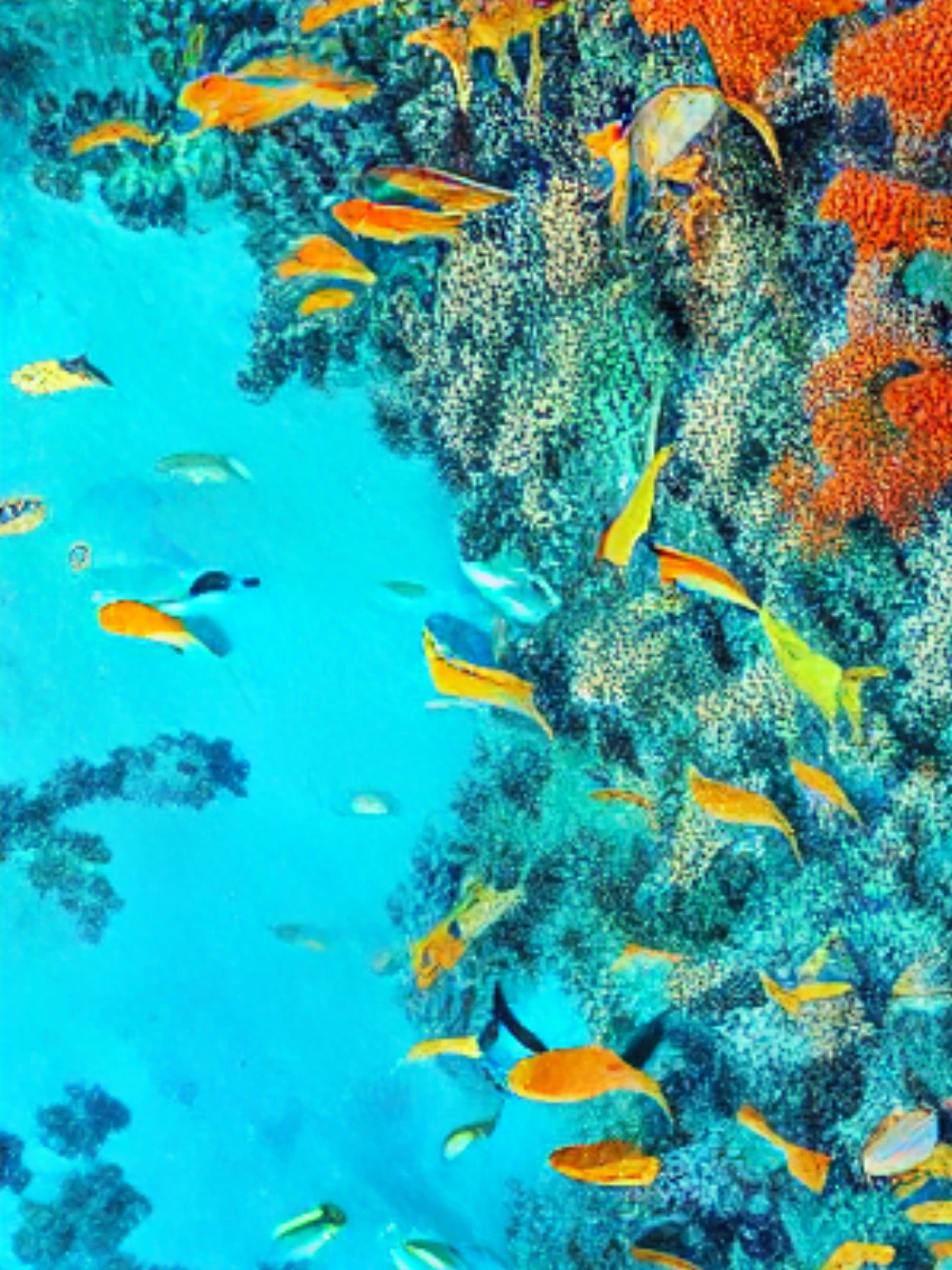 A kaleidoscope of coral hues undulates beneath turquoise waves, as a tapestry of iridescent fish, playful sea turtles, and delicate coral fans sways in rhythmic harmony, alive with the pulse of the ocean's ancient heartbea