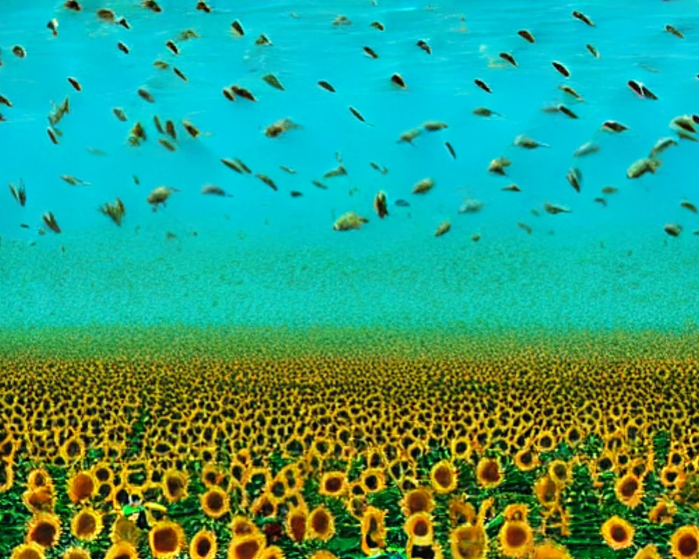 A field of sunflowers facing the sun, A vibrant coral reef teeming with marine life