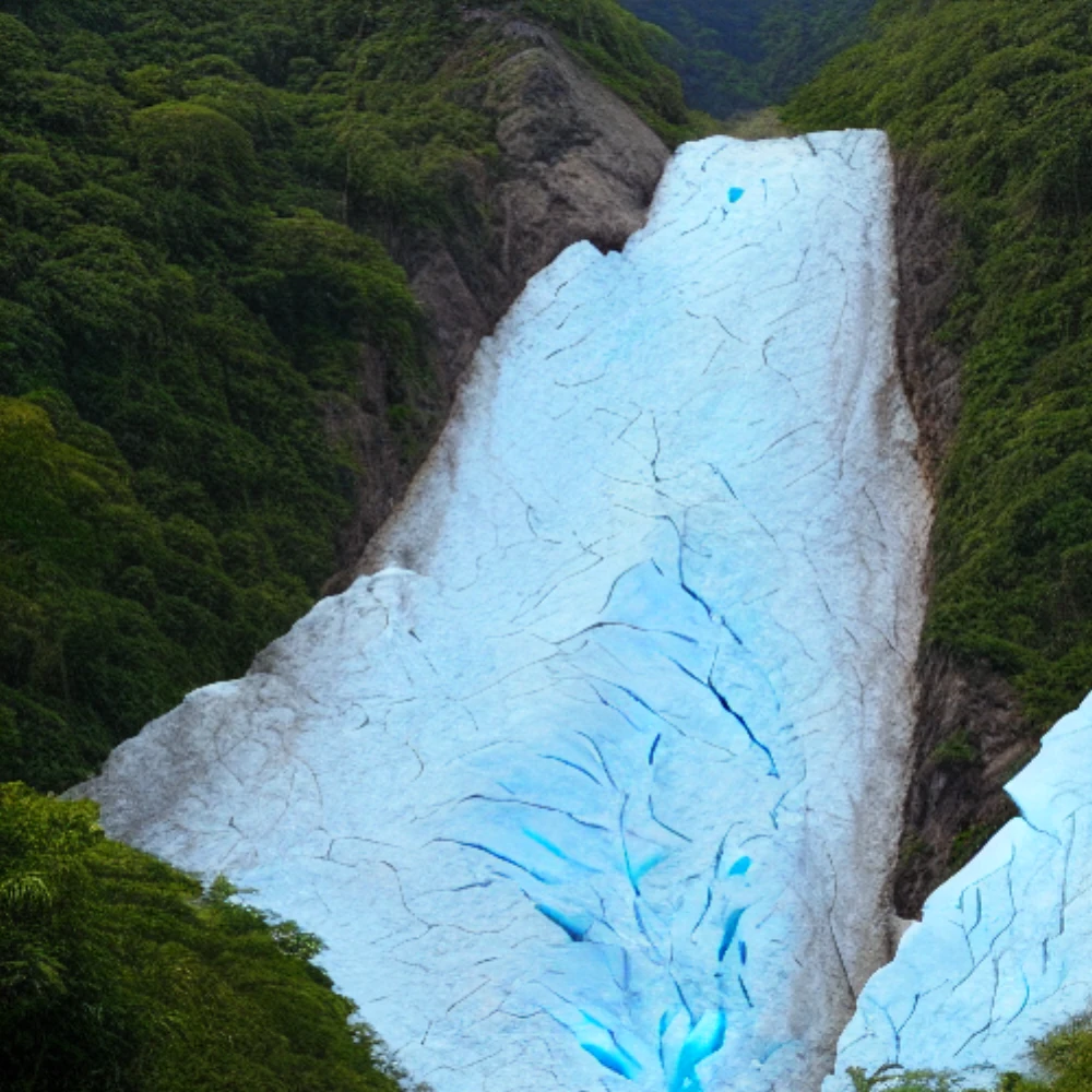 A glacier slowly moving through a valley, A majestic waterfall in a tropical rainforest