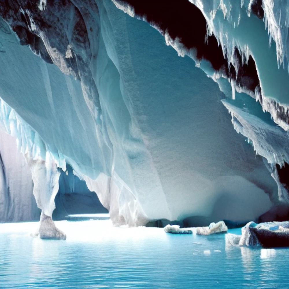 A deep cave with stalactites and stalagmites, A massive iceberg in the middle of the ocean