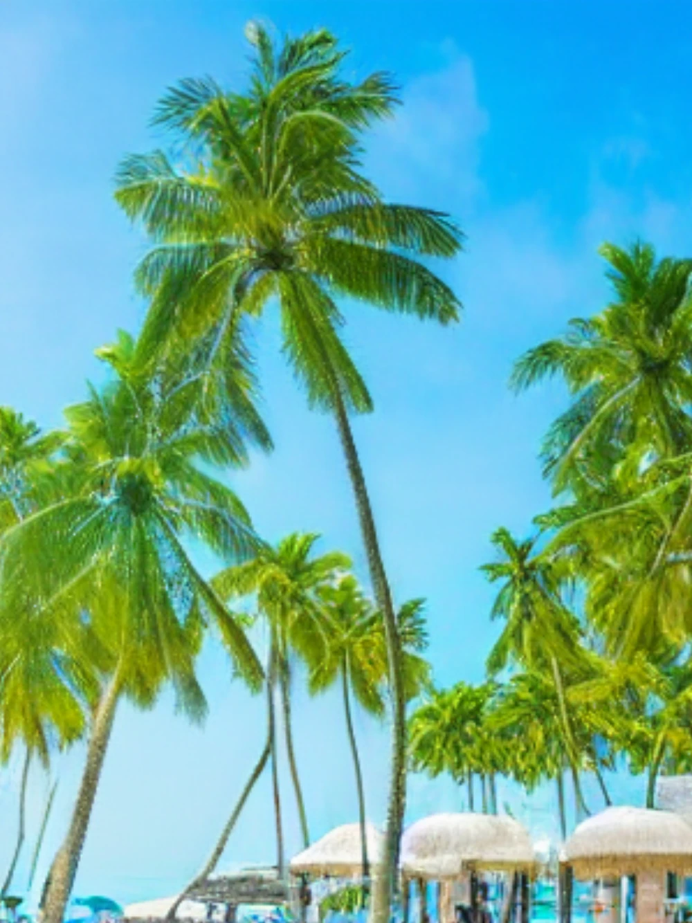 A tropical beach with palm trees and clear blue water, A futuristic city with towering skyscrapers