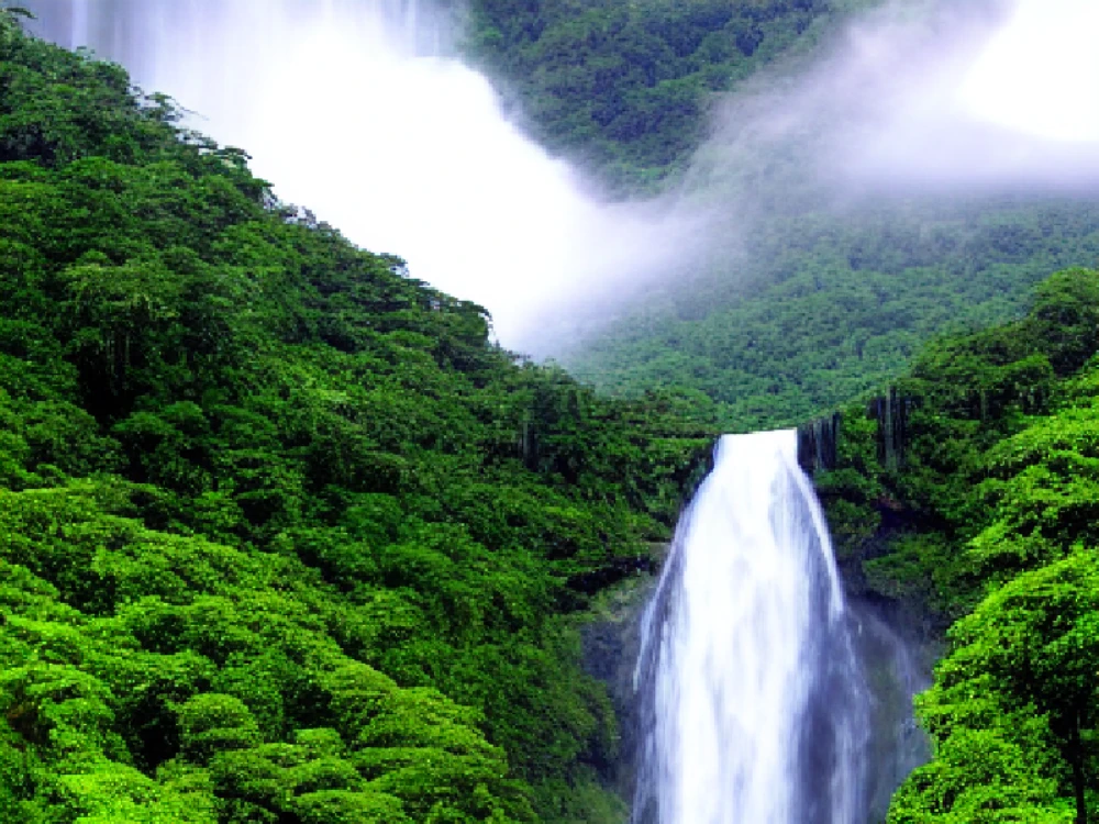 A majestic waterfall in a tropical rainforest, A glacier slowly moving through a valley
