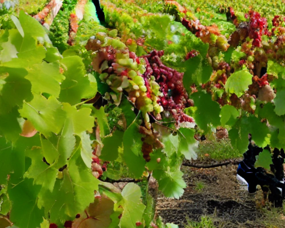 A beautiful garden full of blooming flowers, A vineyard with ripe grapes ready for harvest