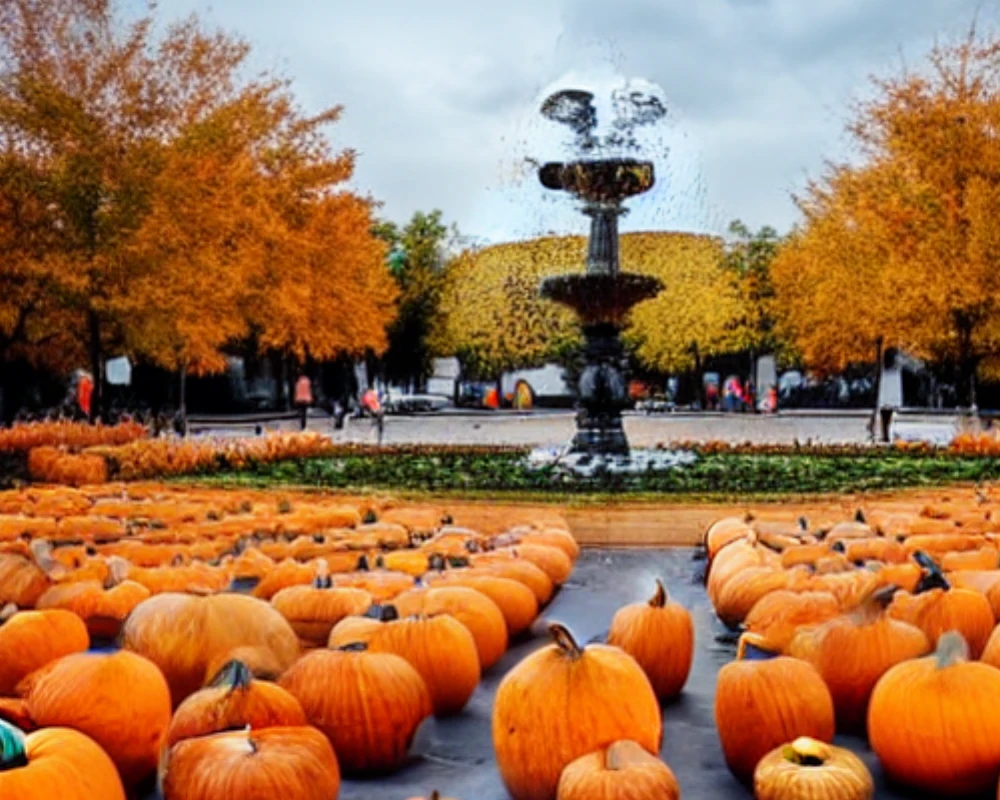 A grand fountain in a city square, A pumpkin patch ready for harvest