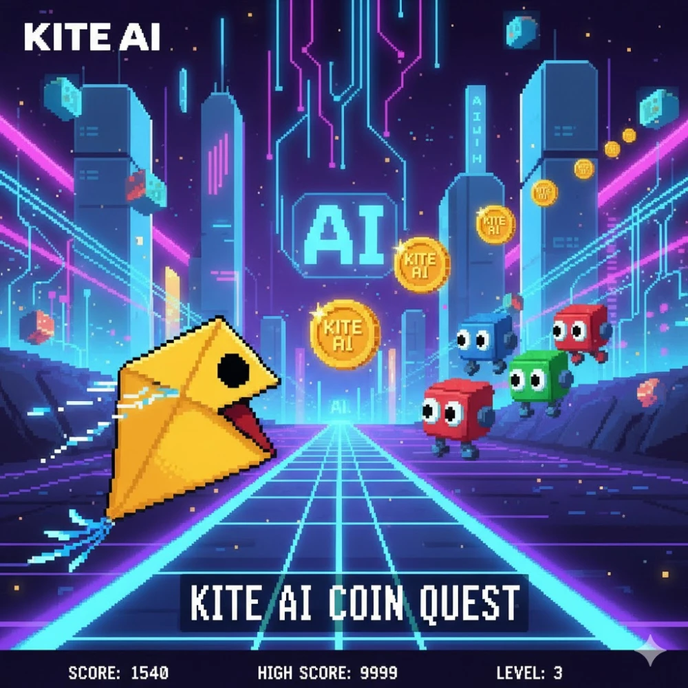 A scene in a retro game screen, with a kite character collecting coins with the KITE AI logo on it, and AI-themed (perhaps slightly futuristic) elements in the background