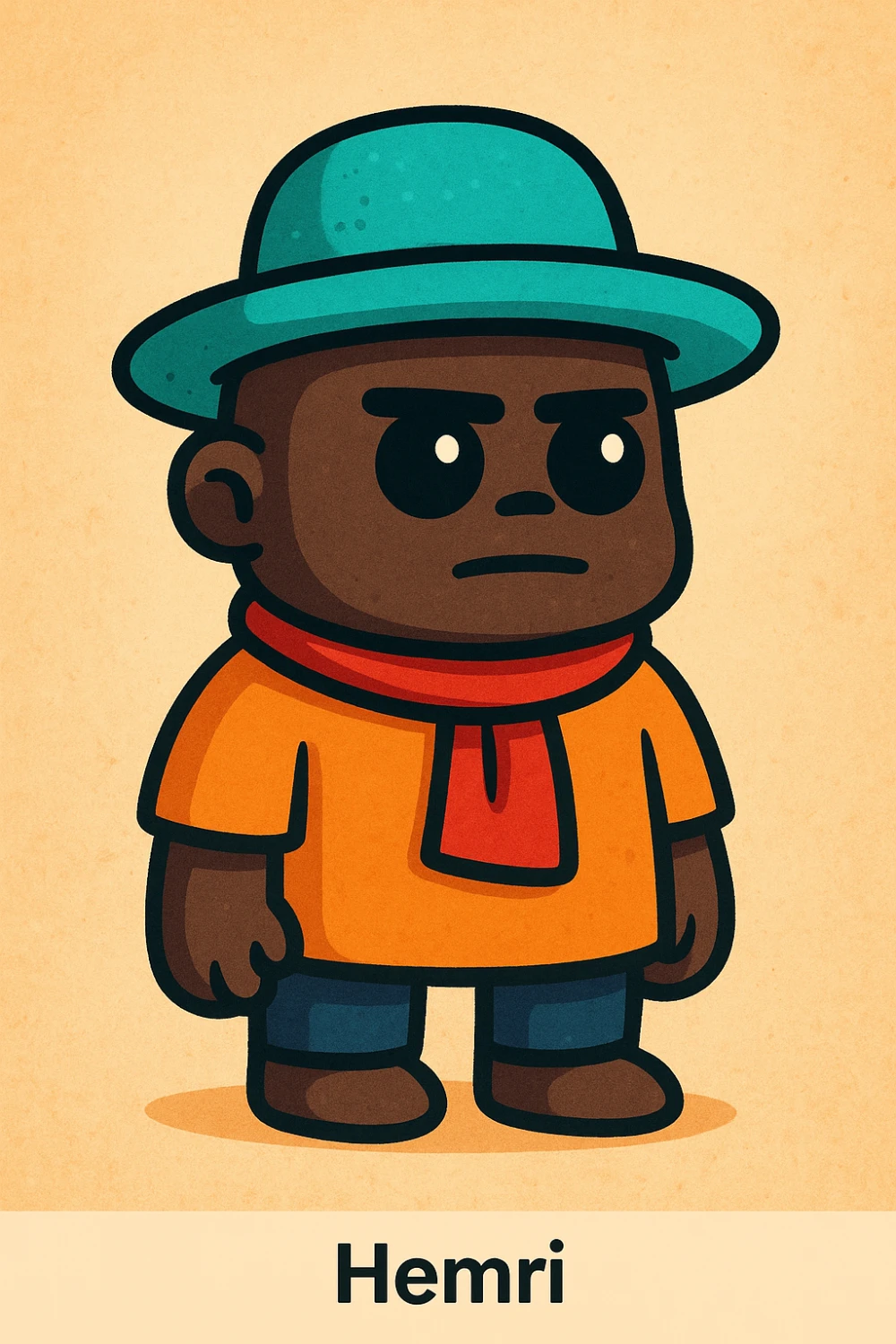 Hemri is a bold and mysterious traveler with expressive eyes and a calm strength. Dressed in bright colors and a turquoise hat, he stands ready for new adventures in his unique world.