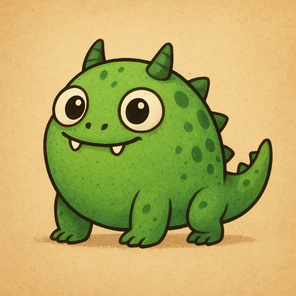 Pizonok is a cheerful green creature with big eyes, tiny horns, and a spiky tail. Friendly and curious, it loves exploring new worlds with a playful grin.