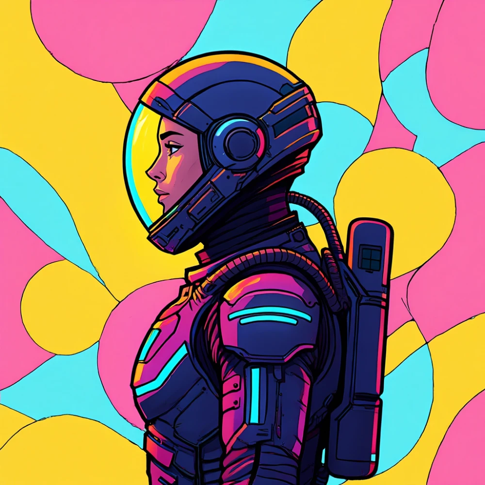 A vibrant 2D NFT-style astronaut illustration, shown in side profile with bold outlines, neon accents, and a colorful abstract background. Ask ChatGPT