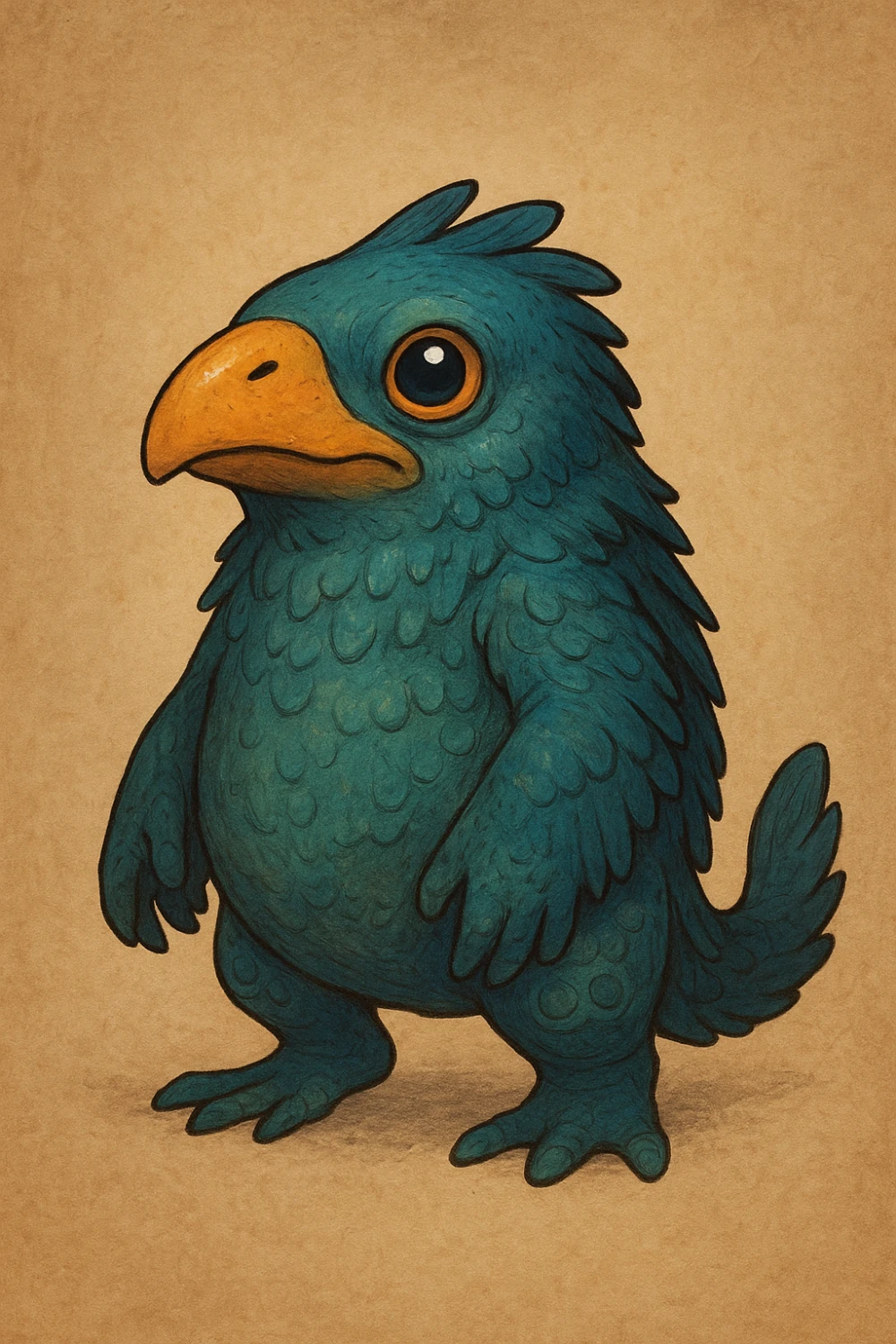 Wertin is a whimsical creature blending bird and amphibian features, with teal feathers, a bright orange beak, and curious, wide eyes that give it a playful yet mysterious charm.