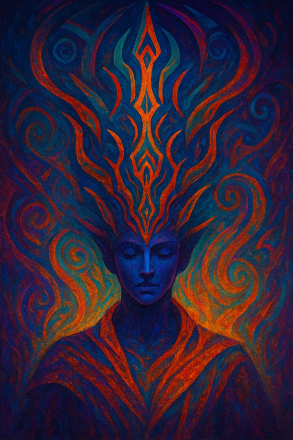 A surreal digital artwork depicting a serene blue figure surrounded by swirling flames of orange and teal, symbolizing balance between calm and energy.