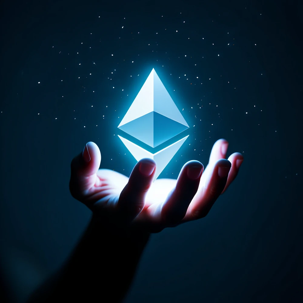 A minimalist yet powerful design of a hand silhouette holding a luminous Ethereum logo against the deep space. A clean and elegant limited edition NFT piece.