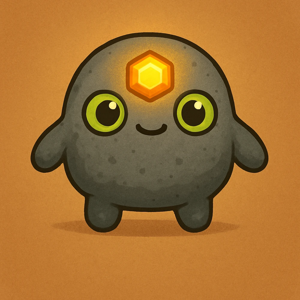 Sytriop is a small stone-like creature with glowing green eyes and an amber crystal on its forehead, radiating warmth and quiet power.