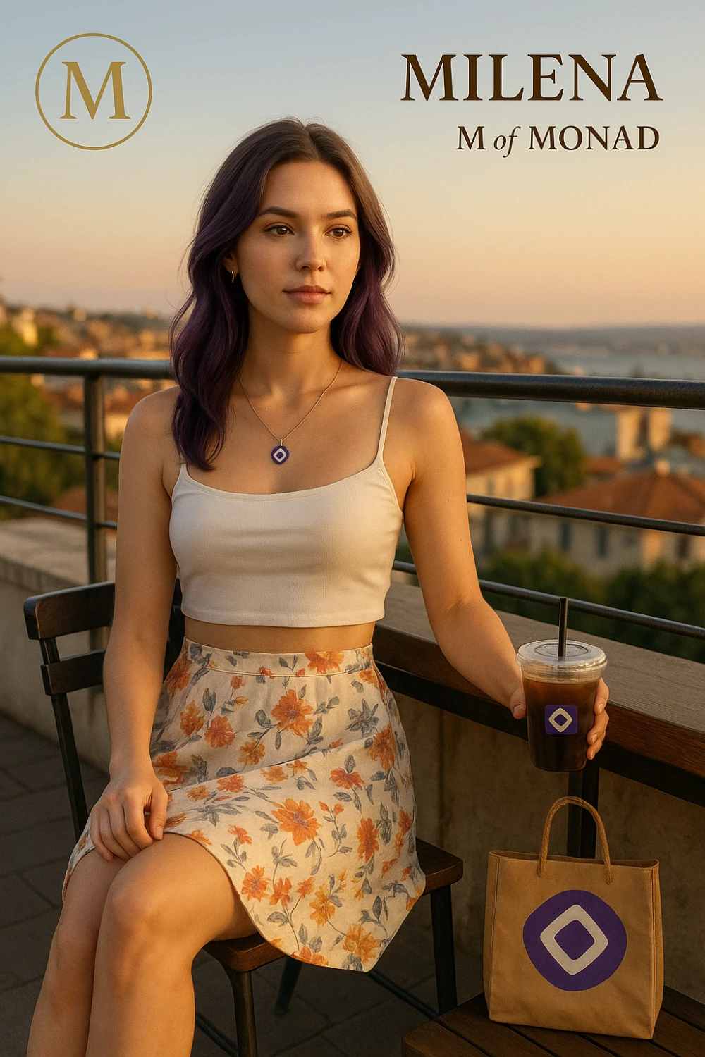Milena embodies the essence of summer with her calm elegance and signature Monad style. Her look blends effortless fashion with the iconic spirit of the Monad brand...MONAD is a five-part digital art series celebrating modern womanhood through fashion, realism, and personality. Each character represents a letter of the name MONAD — together forming a unified feminine symbol.