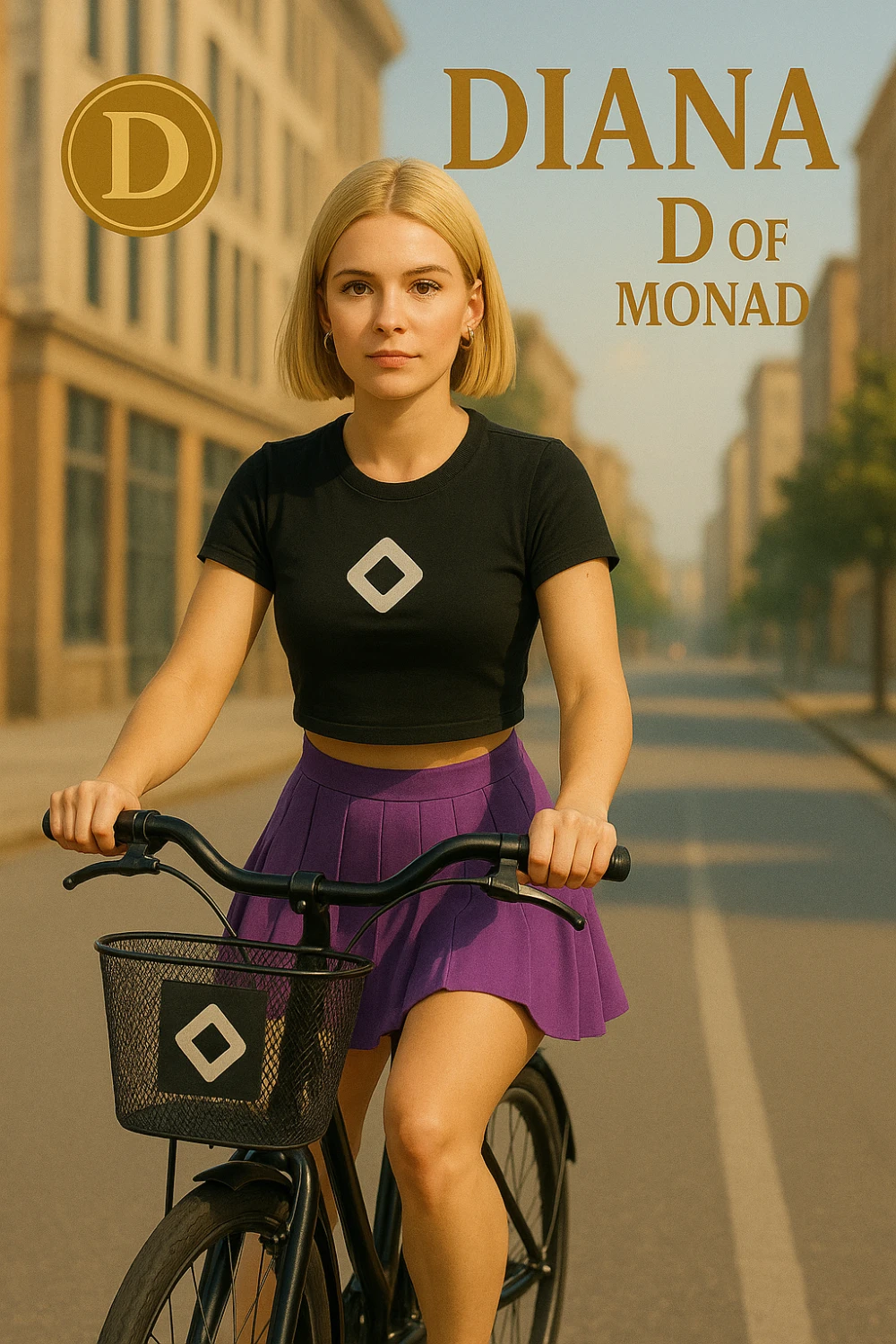 Diana rides through the city with bold energy, her look sharp and unmistakably Monad. The vibrant purple skirt and sleek black crop top reflect her modern, unstoppable spirit....MONAD is a five-part digital art series celebrating modern womanhood through fashion, realism, and personality. Each character represents a letter of the name MONAD — together forming a unified feminine symbol.
