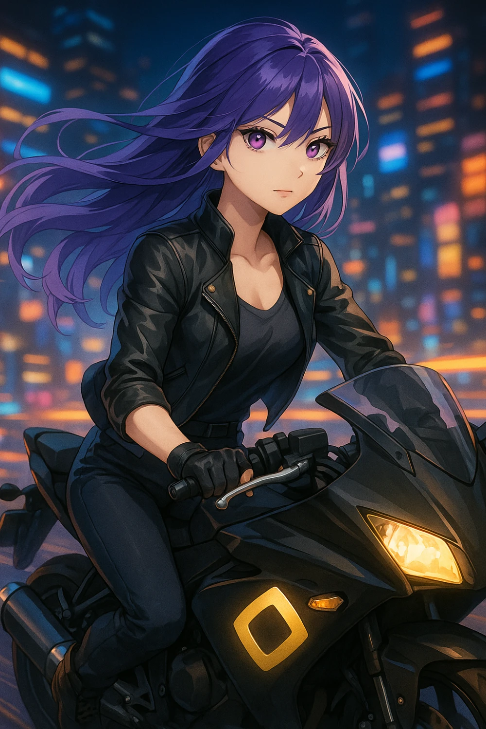 She tears through the neon-lit streets, her lavender hair blazing behind her like a comet in the dark. With violet eyes locked on the path ahead and the golden Monad sigil glowing boldly on her black sportbike, she is a force in motion — fast, fearless, and unstoppable. The city can’t catch her. The chain rides with her.