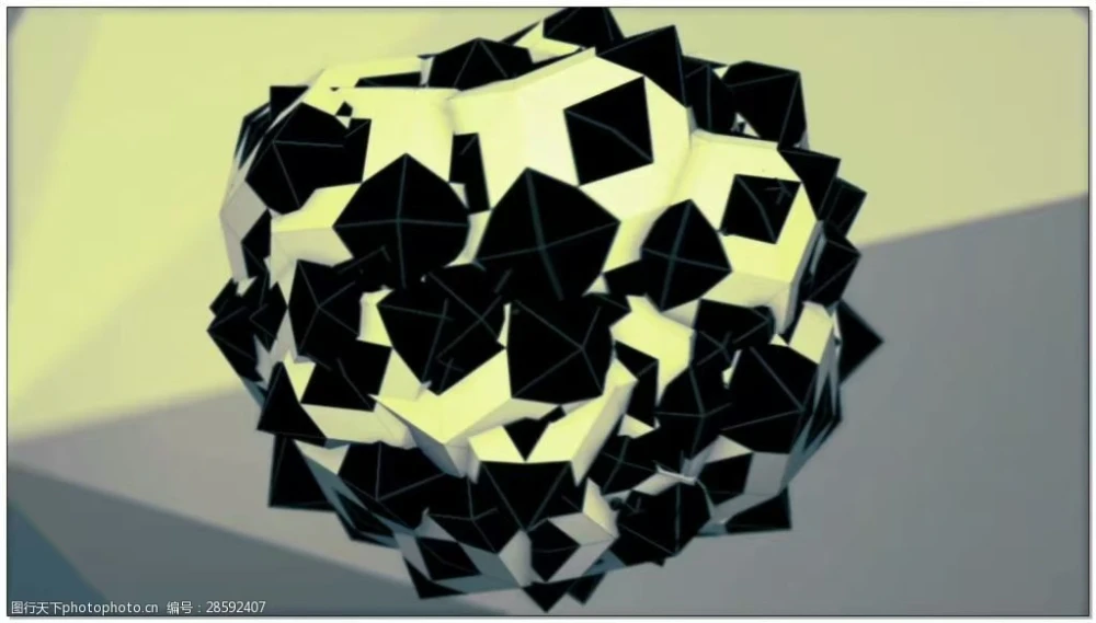A spherical cluster of black triangular pyramids with white highlights rests against a soft gradient background.