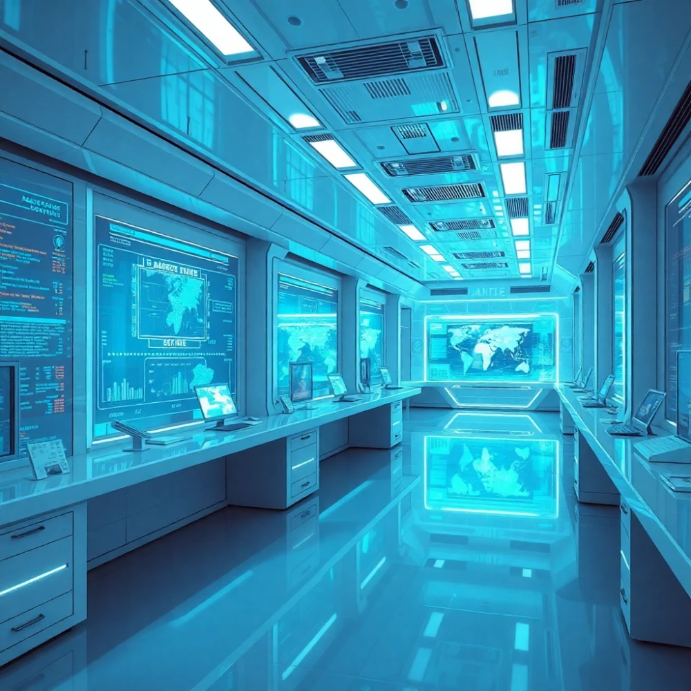 A futuristic laboratory with transparent screens and floating data, clean sci-fi aesthetic