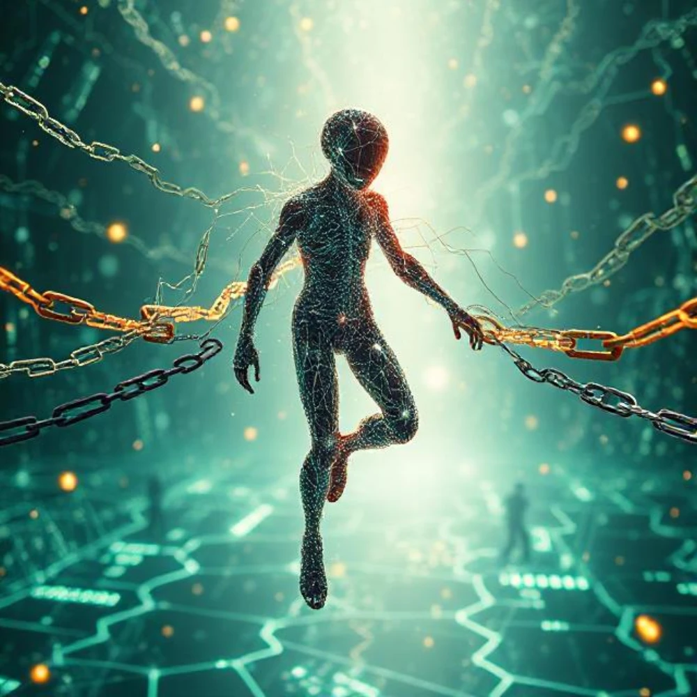 A digital being that drifts between parallel chains, exploring the multiverse of decentralized worlds.