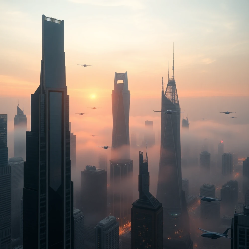 A futuristic city skyline at dawn, flying vehicles, soft fog between skyscrapers, ultra-detailed, cinematic lighting