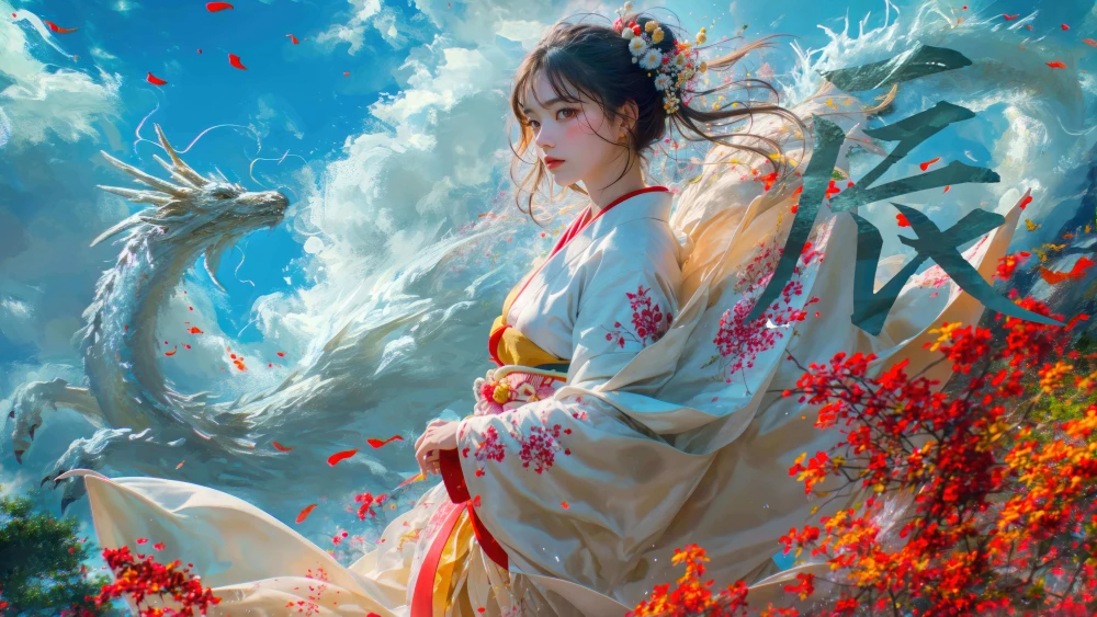Fantasy and Anime with a Dragon and a girl in Kimono
