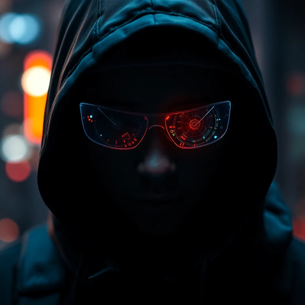 A futuristic hacker wearing a hood, glowing interface reflected in eyes