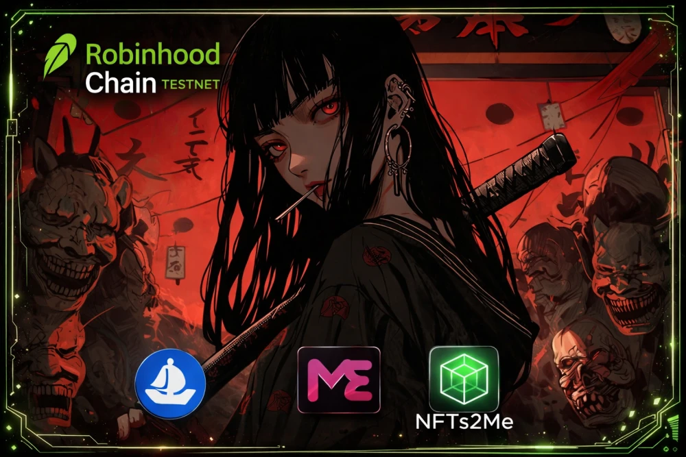 A striking fusion of dark folklore and digital rebellion, featuring the iconic Robinhood Chain Testnet branding alongside an Oni-guarded warrior. This exclusive genesis asset marks your early membership in the next era of high-speed decentralized trading and NFT minting.