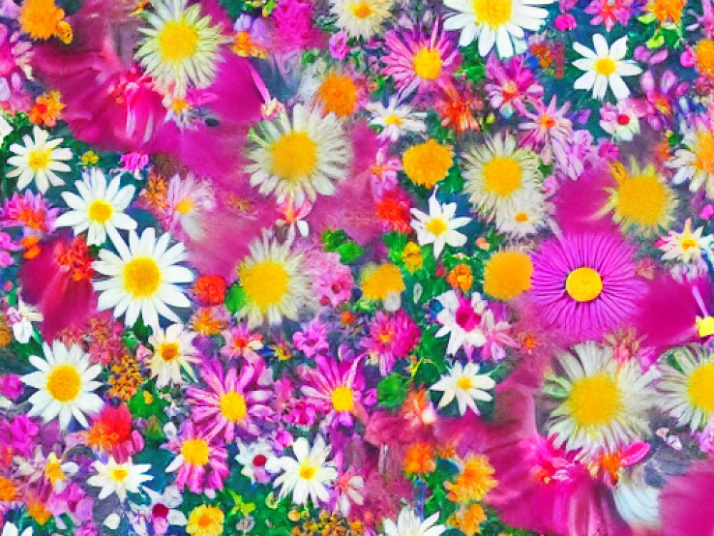 Vibrant petals unfurl in every hue, blanketing a serene oasis with an intoxicating tapestry of color and scent, as a kaleidoscope of blooms – velvety roses, sun-kissed daisies, and delicate lilies – sway gently in the whis