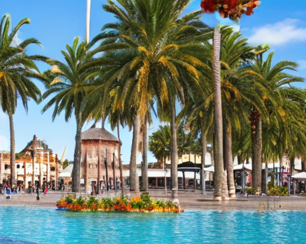 A grand fountain in a city square, A tropical beach with palm trees and clear blue water